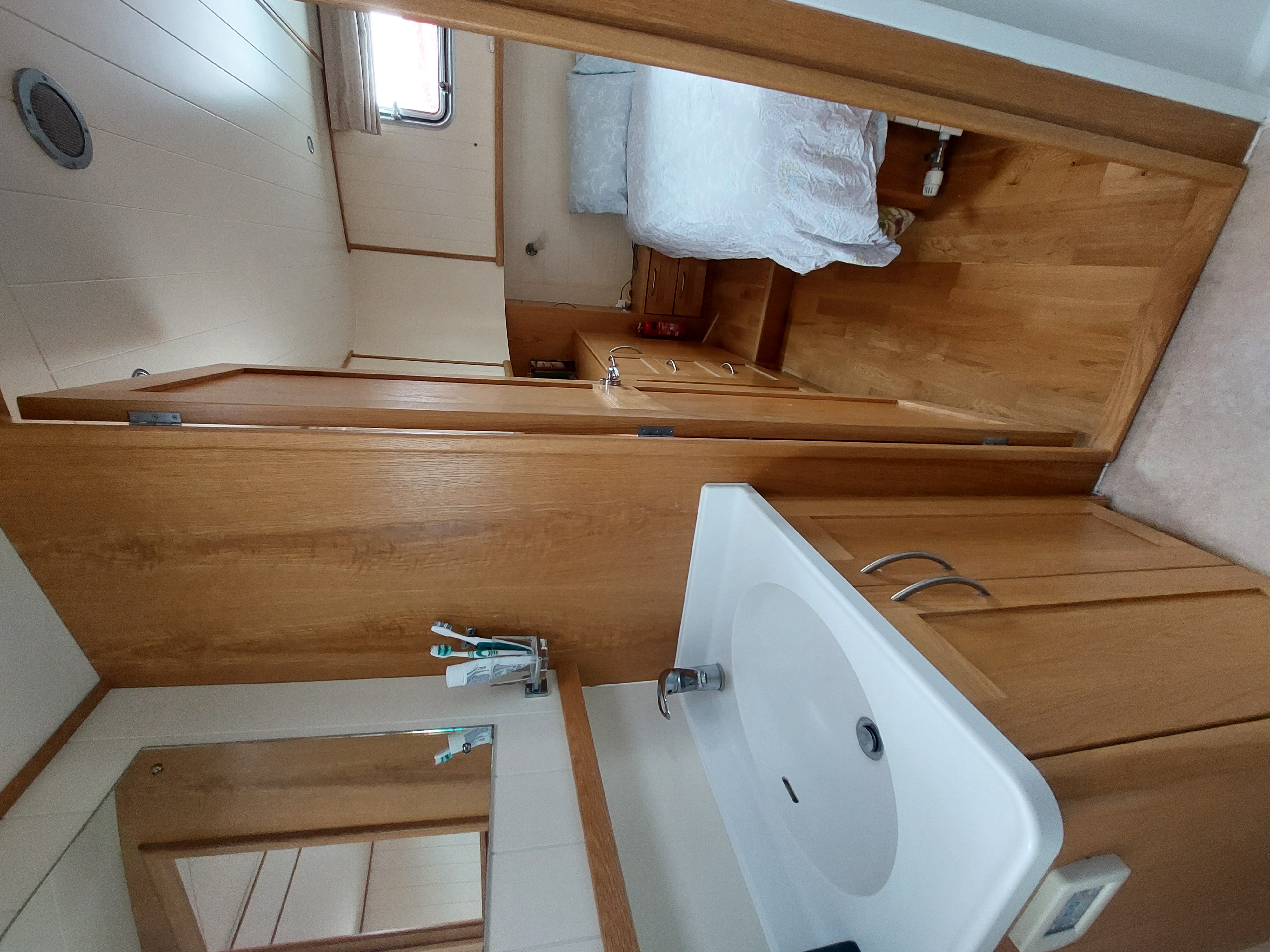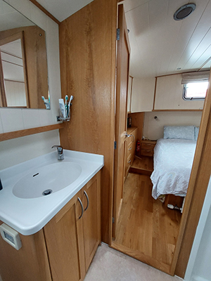 The large, ensuite shower room features a walk-in shower and a heated towel rail. There’s a wash basin with a mixer tap and storage, and the toilet is Jabsco with an electric flush/macerator system.