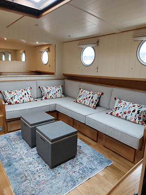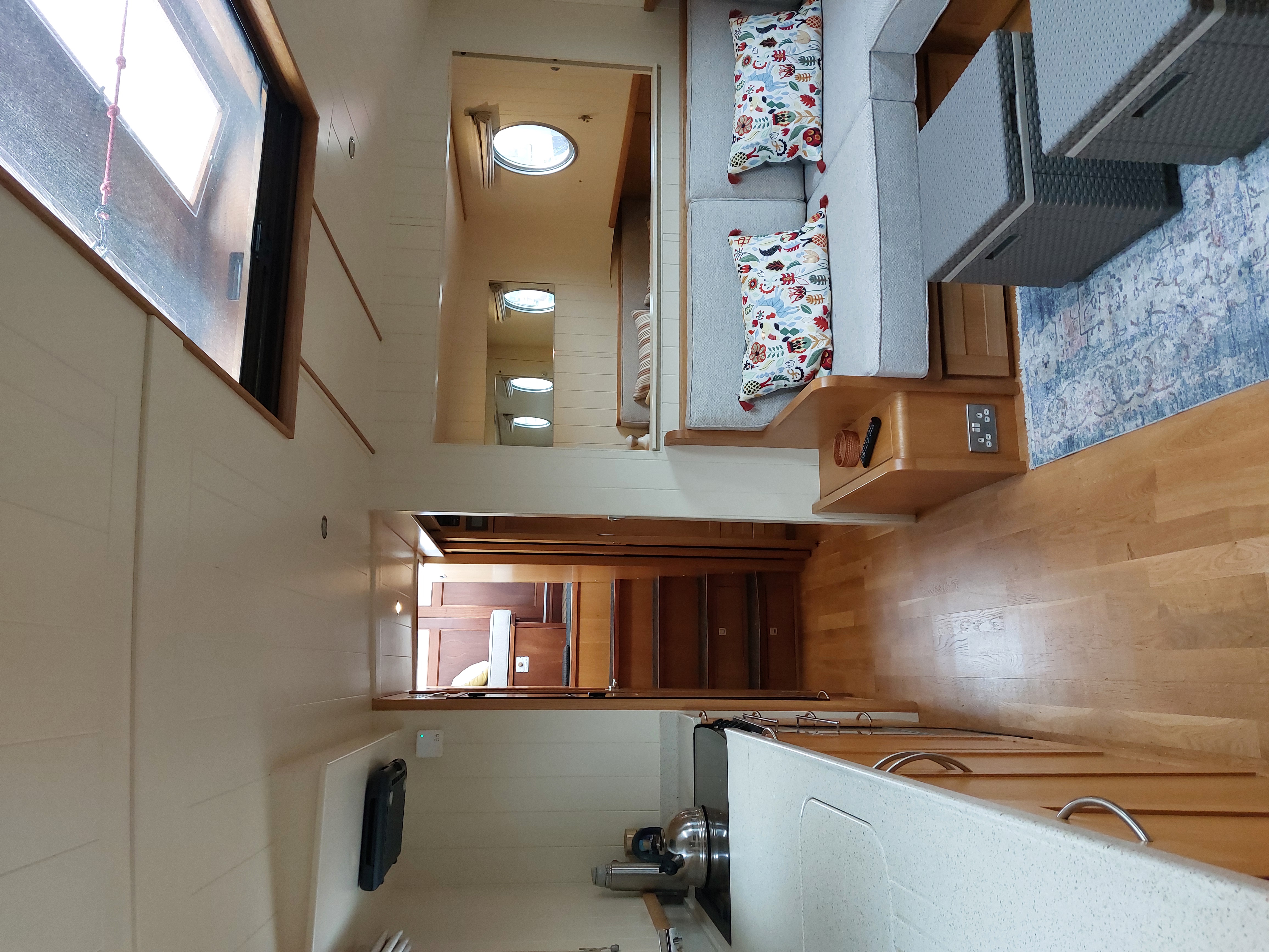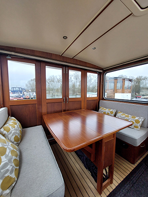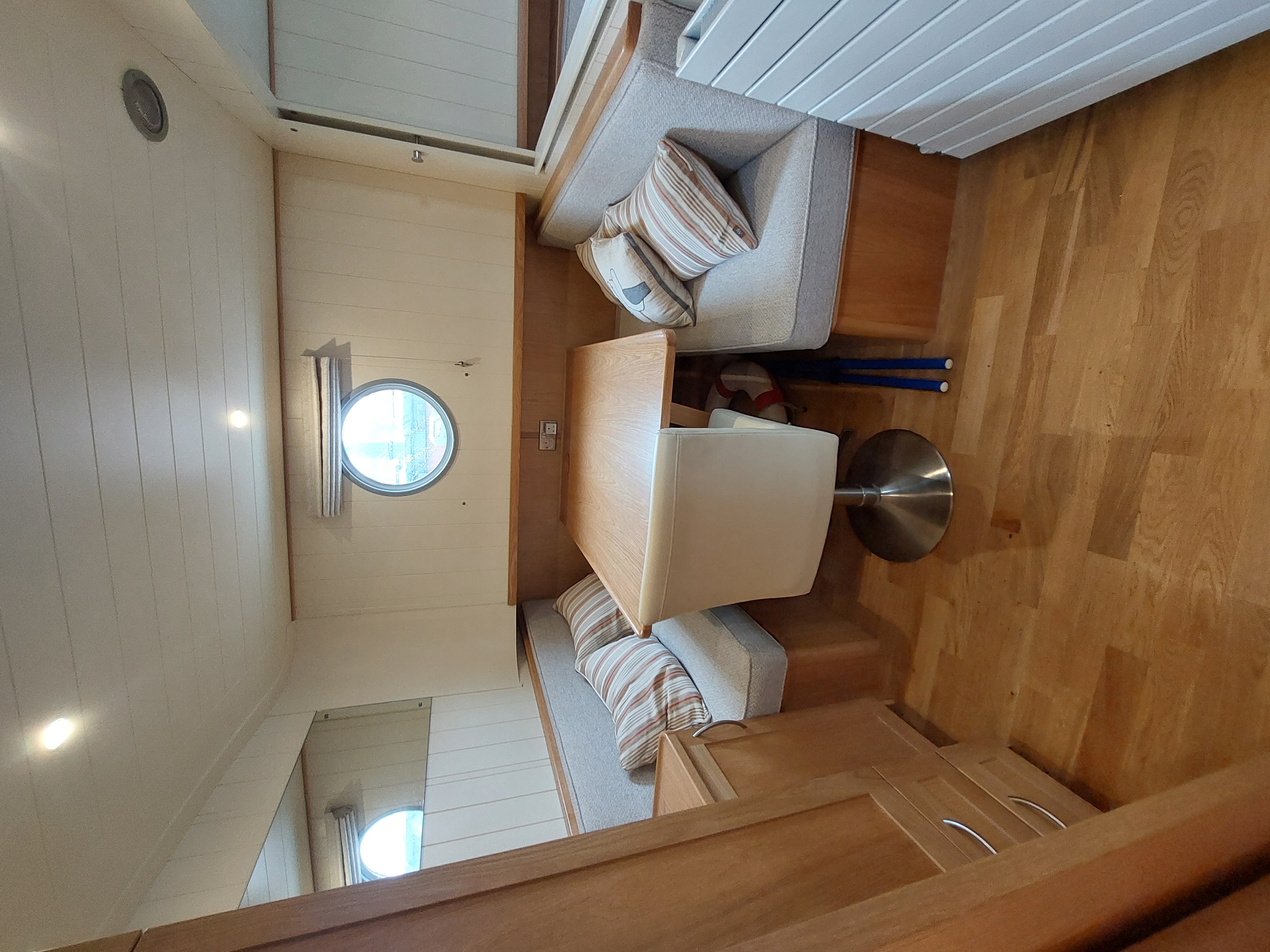 With oak veneer flooring, large portholes (18 inches) and neutral soft furnishings throughout – including built-in sofas, dinette seating, blinds and worktops – Happy Chance is a bright, airy and light-filled boat with plenty of storage space.