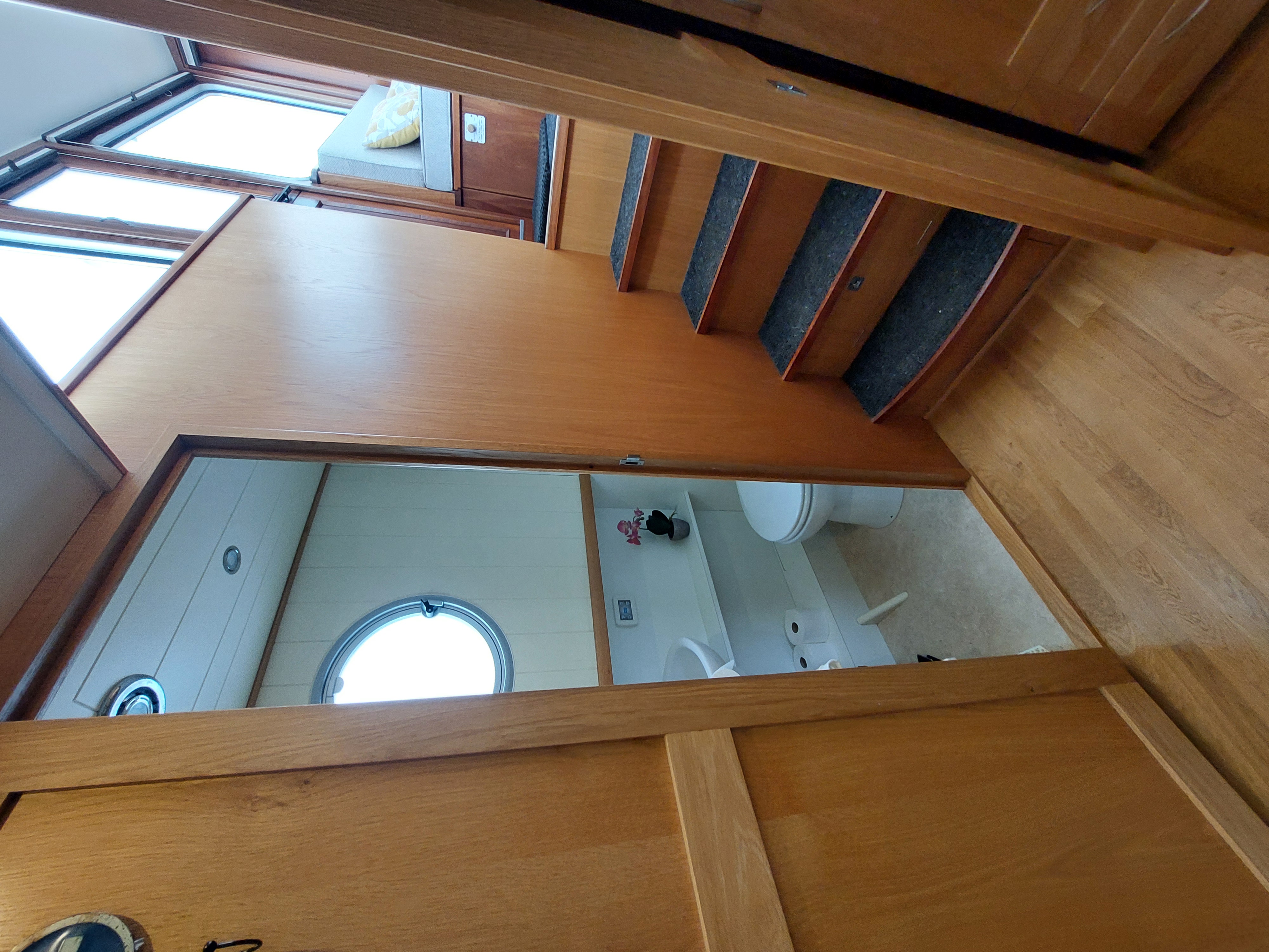 Steps lead up from the saloon to the wheelhouse, a wonderful area to relax and enjoy the views, especially on warm sunny days. As the floor in the wheelhouse and on the back deck is made of the same flexi-teak, when you open the French Door doors you get that indoor-outdoor, continuous space feeling.