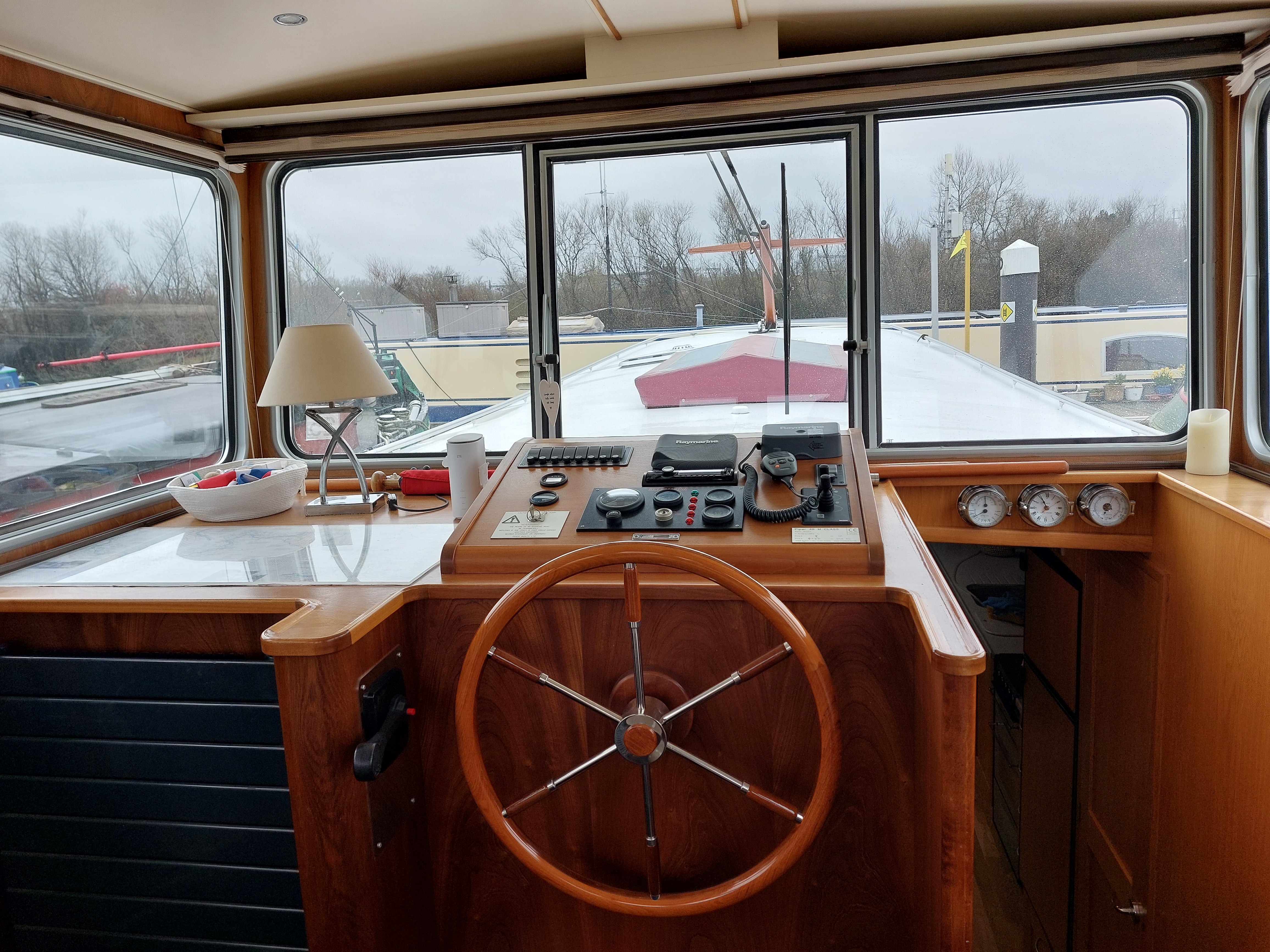 Located on the dashboard area in the wheelhouse are all the controls needed for when on the move. There is a selection of switches that control the navigation lights, horn, windscreen wiper, steaming light, anchor light and deck lights. There are numerous gauges that provides information regarding RPM, oil pressure, battery voltage and temperature, Rudder angle and water depth. The Raymarine VHF DSC radio is installed here along with Raymarine Chart Plotter and AIS class B. The Joysticks for the Bow and Stern Thrusters are also located here.