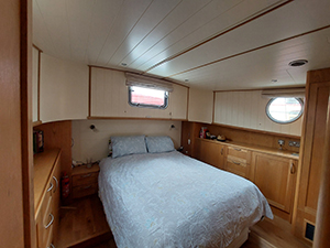 Steps lead down into the engine room from the wheelhouse where you will find the Mastervolt electrical system, the battery bank, the Keel cooled engine cooling system, 5kw diesel generator, Hot water tank, Kabola boiler and 75 Litre IsoTemp Hot Water Tank, Stern Thruster, Weed Hatch inspection point, storage for tools and equipment, and central to the space is the Beta Marine 105hp ( 800 hours ) turbo charged engine coupled to a PRM hydraulic gearbox.