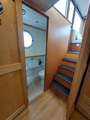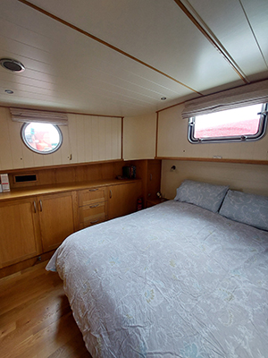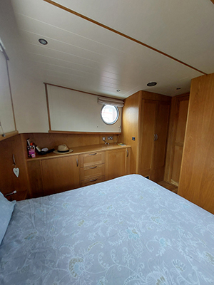 Happy Chance was the first Piper barge to have a convertible cabin/dinette for maximum use of space and flexibility. It has a sliding door opposite the guest toilet and a sliding ‘wall’ that overlooks the saloon. The dinette can be used as an office, somewhere to do arts & crafts, sew, make jigsaws, have a bite to eat while watching TV, etc. When the doors are closed and the ‘wall’ is lifted, it becomes a private bedroom for guests, with a bedside table, storage space for suitcases under the bed and a small cupboard with drawers for clothes.