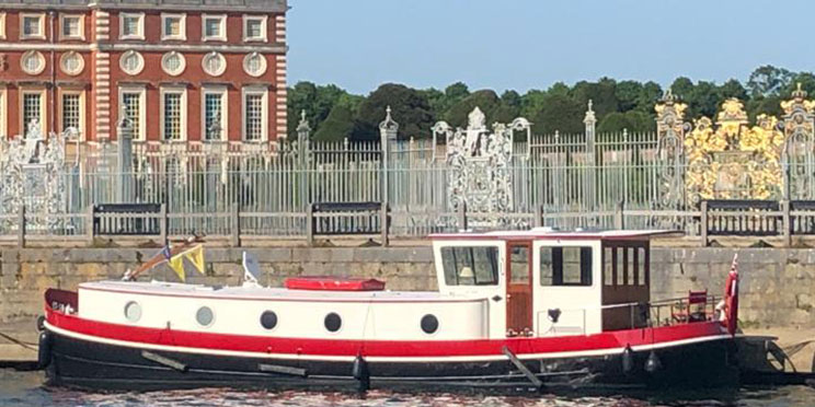 In September 2020, she was transported by lorry to Europe during Covid for a change of scene and was moored in Bruges during the winter and Nieuwpoort during the summer. She was then transported back to the UK by lorry in February 2023, and after a major upgrade at Pipers (repainted tops sides, 8 new solar panels, new interior upholstery and other technical updates), she returned to the Thames in May 2023.